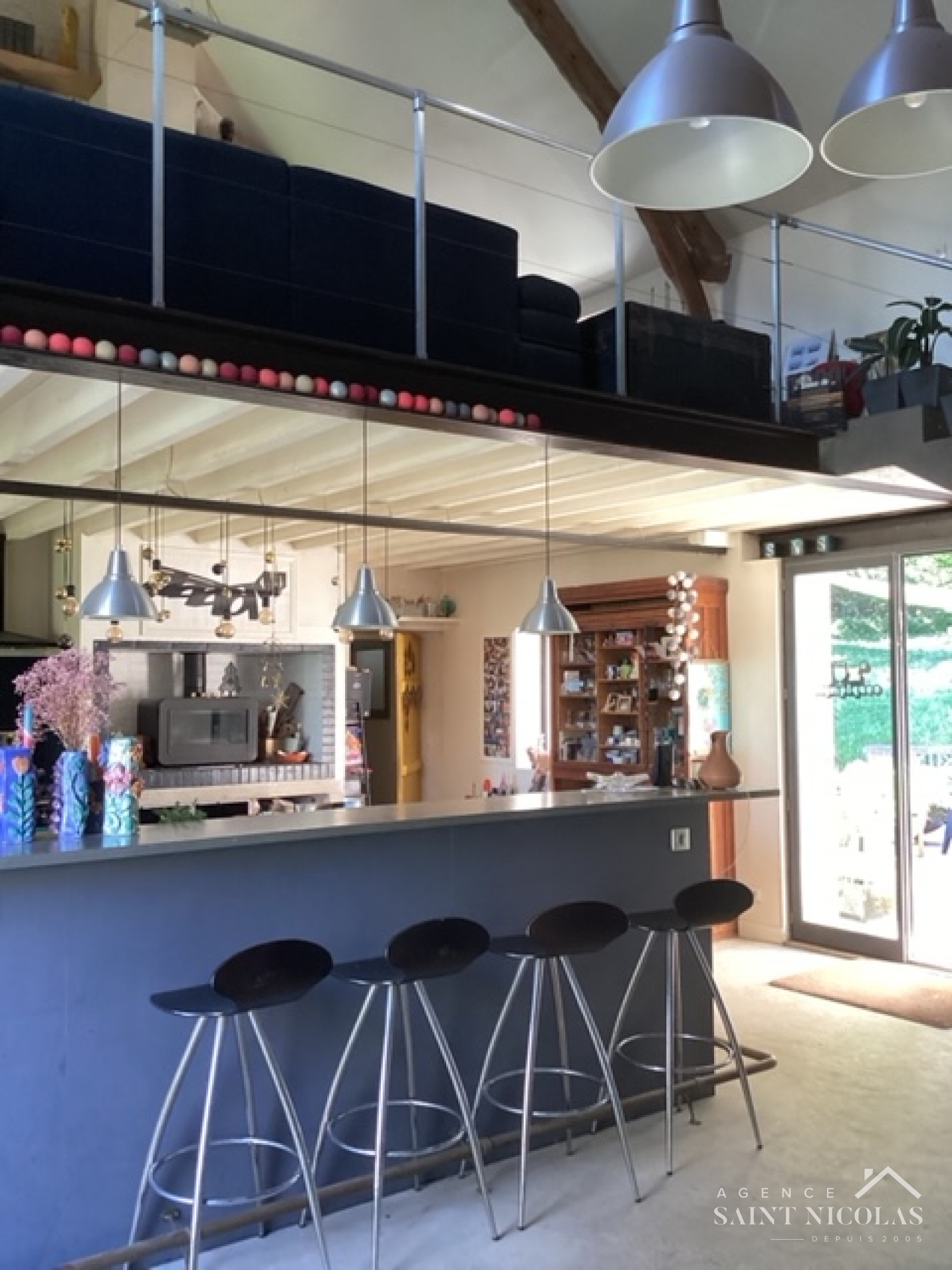 Vous accédez par une agréable terrasse ceinte de glycines à un séjour cathédrale ouvert sur une vaste cuisine dinatoire, agrémentée d’un insert. Bénéficinant d'une double exposition et d'un éclairage naturel zénithal, la lumière naturelle s’y déploie, soulignant la vue sur le jardin et les terrasses, créant une continuité parfaite entre l’intérieur et l’extérieur.