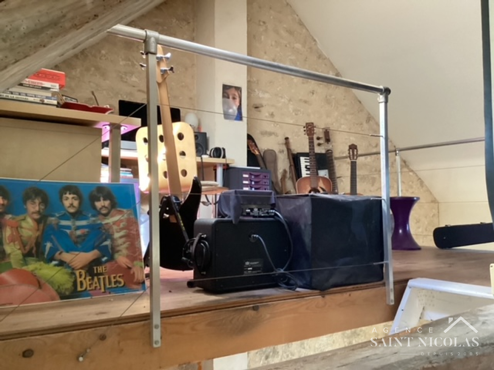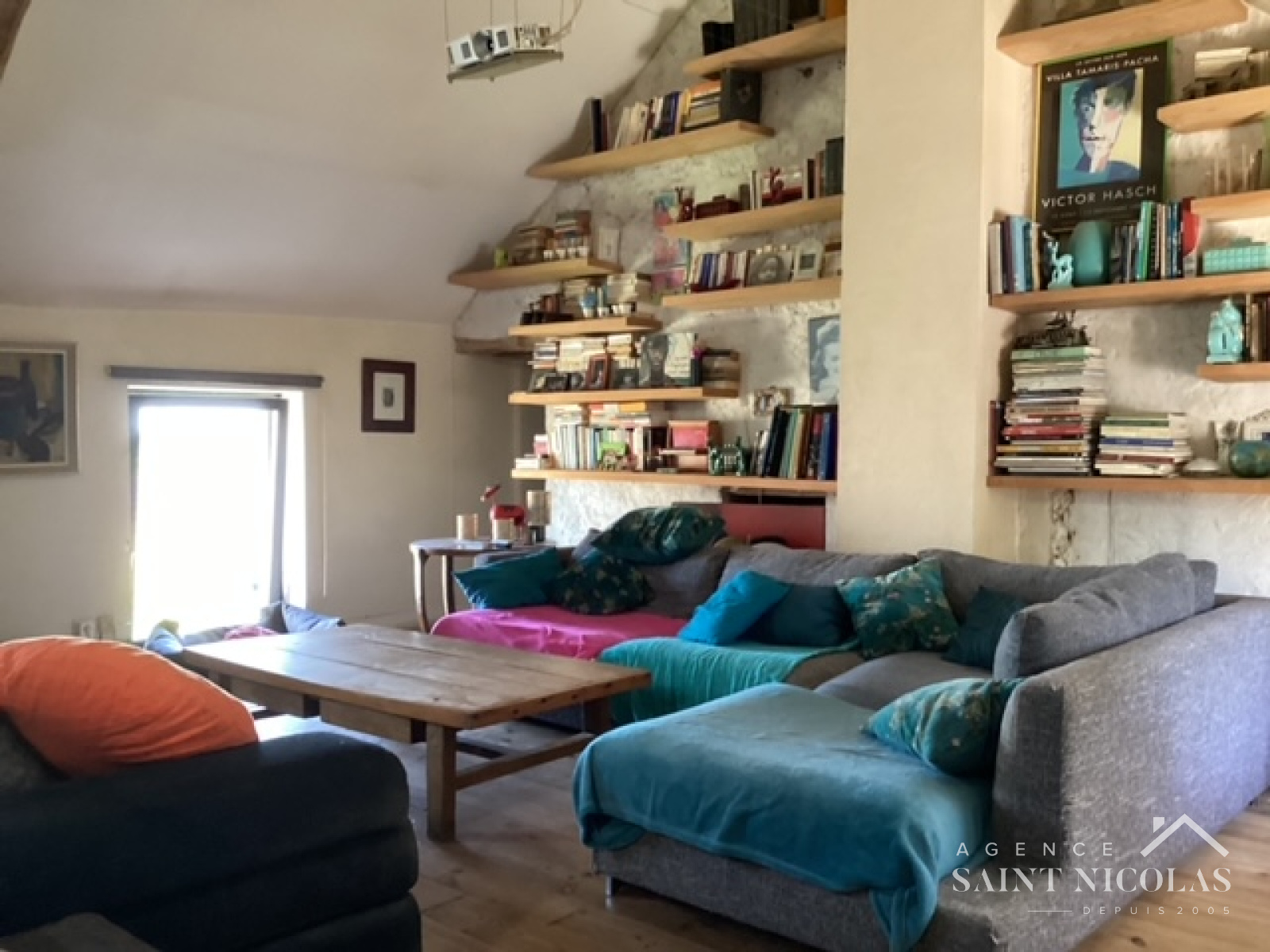Le salon tout en volumes avec sa bibliothèque laissant apparaître la pierre de taille, est un espace de convivialité ouvrant sur une mezzanine, aujourd’hui salon de musique. On devine déjà les moments chaleureux de partage en famille et entre amis.